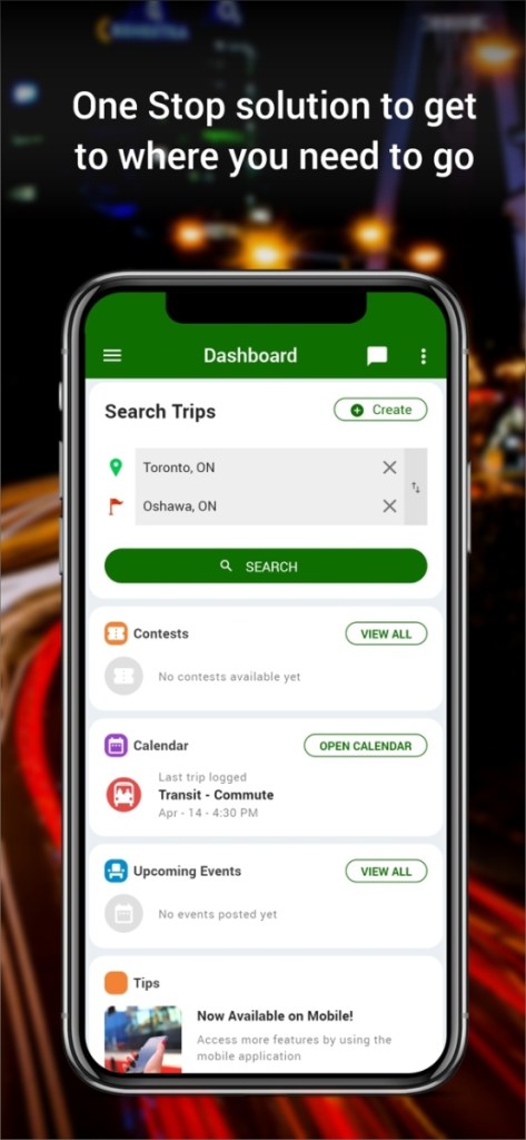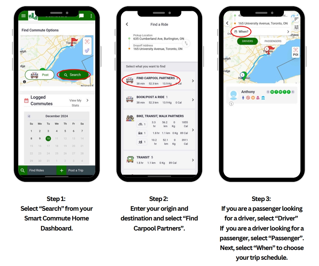Carpooling is one of the most utilized and valuable features of the Smartcommute.ca app. Employees can find carpool partners within their organization, making it easier to coordinate shared rides. Whether users need a daily carpool partner or a one-time ride for a special event, the app provides tailored matches.