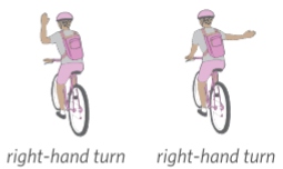 Signal your turn before you reach an intersection or plan to switch lanes by using the hand signals or clearly pointing. Additionally, make sure to look over your shoulder or the direction of where you plan to go to ensure it is safe to do so. The cycling hand signalling can be found below: