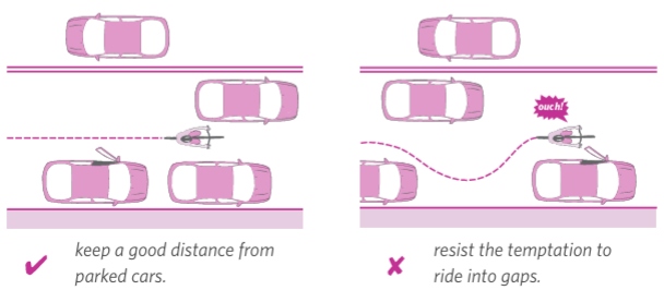 Whenever you are cycling on the road, ride defensively. This means you must cycle predictably, anticipate other road user’s movements, and make eye contact where necessary. Ride in a straight, predictable line. Do not swerve in and out of traffic, construction zones, or parked cars (see diagram below). It is your right to take up as much space as needed to be safe.